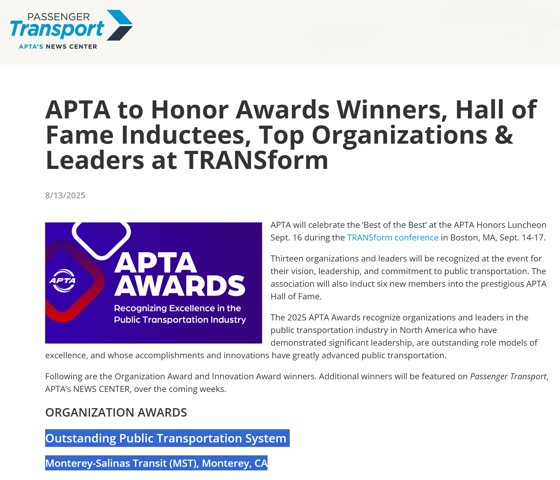 Outstanding Public Transportation System - Monterey-Salinas Transit (MST), Monterey, CA