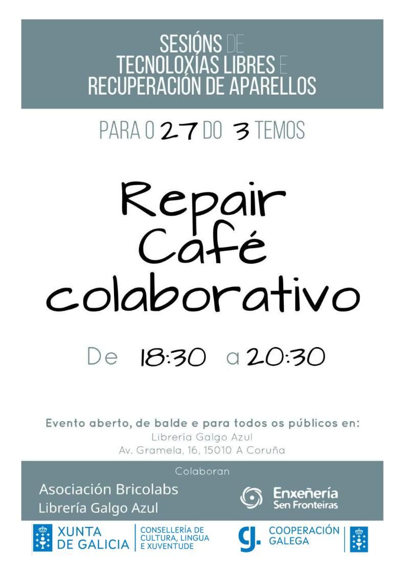 <p>📣 Novo obradoiro de reparación colectiva!</p><p>Dende electrónica a roupa, mesmo libros, ou o que se vos ocorra.</p><p>🪛 Se sabes algo de reparación, vén botar unha man. <br>🆘 Se tes algo para arranxar, vente e outra xente axudarache<br>🥰 Se simplemente queres botar unha ollada e aprender, serás tamén benvidx!</p><p>📅 27 de marzo 2026<br>🕕 18:30-20:30h<br>📌 Libraría Galgo Azul <a href="/tags/acoruña/" rel="tag">#ACoruña</a> </p><p><a href="/tags/repaircafe/" rel="tag">#RepairCafe</a> polo <a href="/tags/dereitoareparar/" rel="tag">#DereitoAReparar</a> <a href="/tags/righttorepair/" rel="tag">#RightToRepair</a> <a href="/tags/irpfformativo/" rel="tag">#IRPFformativo</a></p>