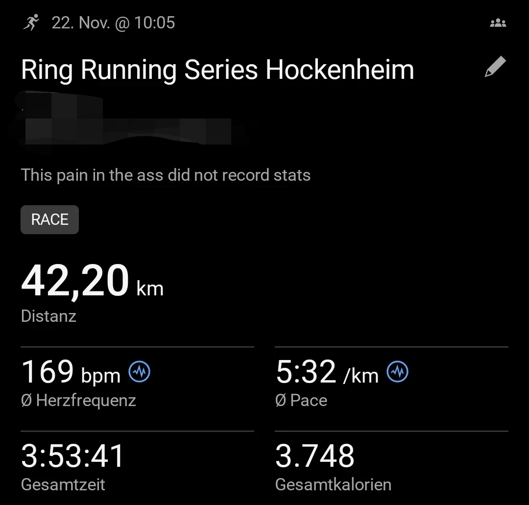 After I got sick on October 5th and could not run the #Cologne #Marathon, I completed the Marathon of the Ring #Running Series at the #Hockenheimring today and ran personal best time (which has been 3:56:56 before).