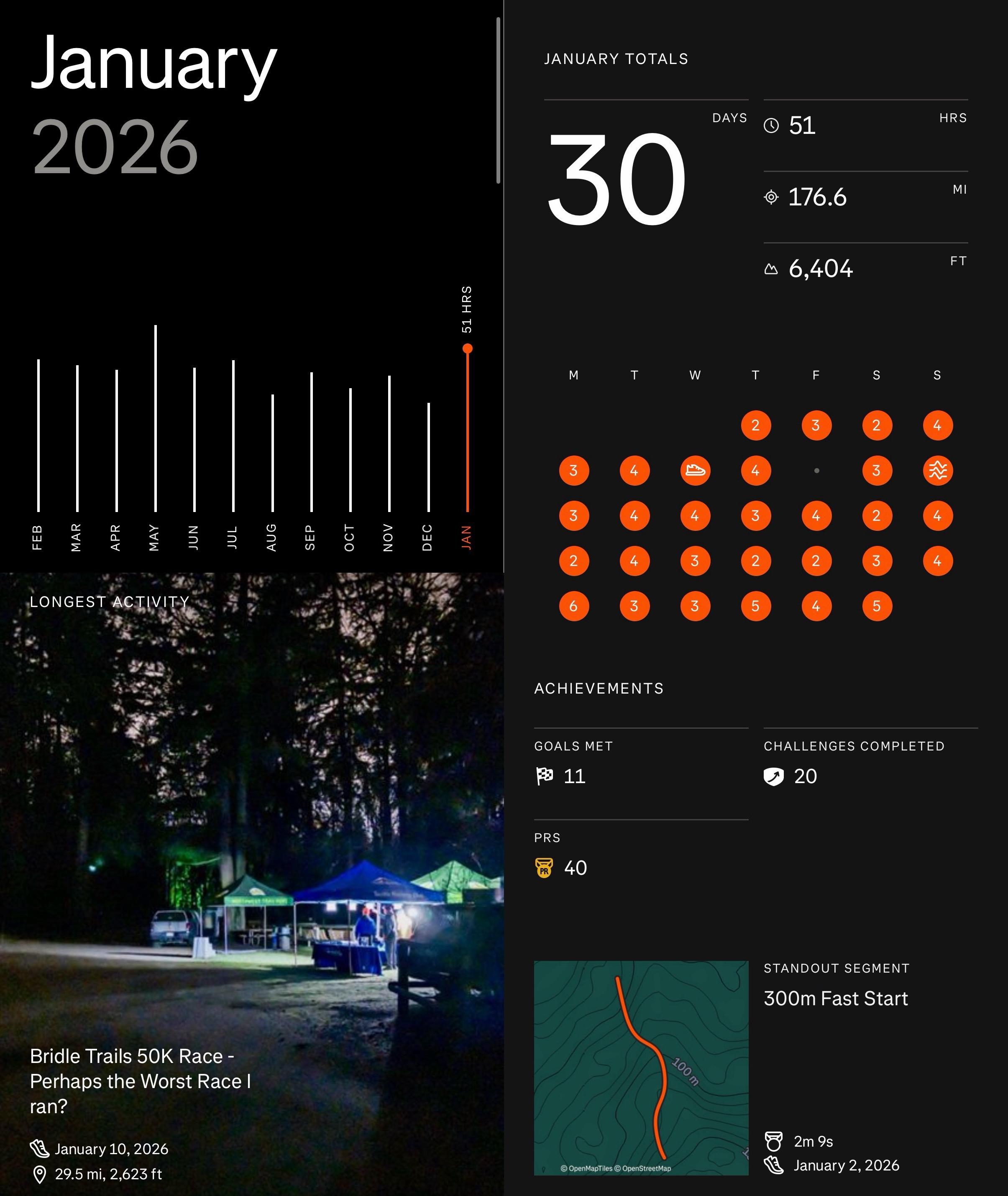 I missed my 208mi monthly target due to tapering and recovery around a rough #50K race at Bridle Trails. A lingering cough hurt sleep and breathing too.