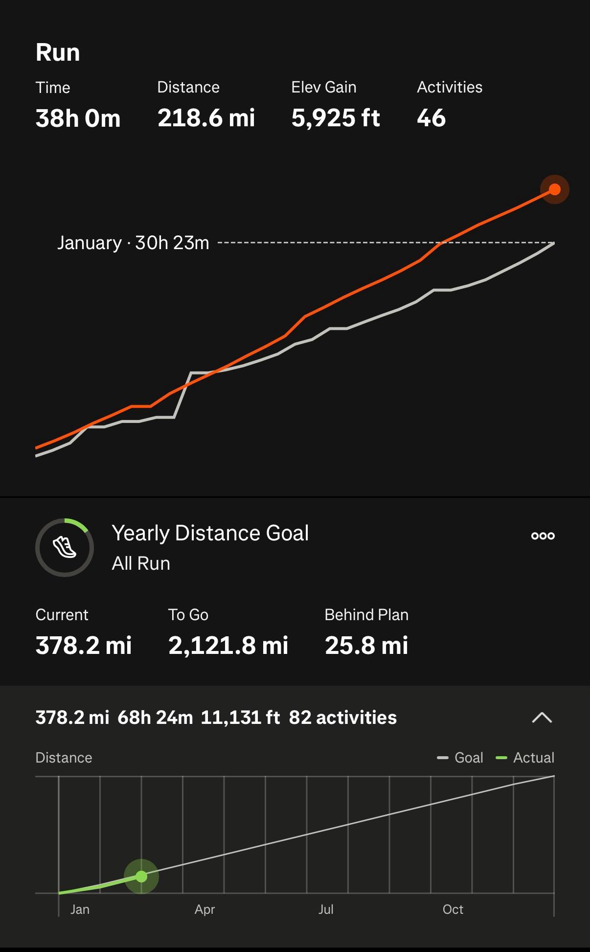 <p>February <a href="/tags/running/" rel="tag">#running</a> recap: mileage climbed from 159.5 → 218.6mi (228.1 including walking). EG rose 5,206 → 5,925ft, and run time increased 30.5 → 38hrs.</p><p>This has been a strong comeback month: despite just 28 days, I hit my 208mi monthly target and cut my yearly deficit from 52.7 to 25.8mi. My VO2max also jumped 45.9 → 50.6!</p><p>I'm now just 25.8mi behind my 2,500mi yearly goal and back on track! Woodinville Half + Redmond City <a href="/tags/marathon/" rel="tag">#Marathon</a> up next. Onward!</p>
