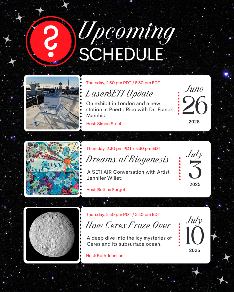 Our upcoming #SETILive interviews look at a new #LaserSETI exhibit and observatory location, the stunning artwork created in honor of this year's #DrakeAward recipients, and new science that reveals how #Ceres froze. Subscribe to our YouTube channel for notifications: https://www.youtube.com/SETIInstitute