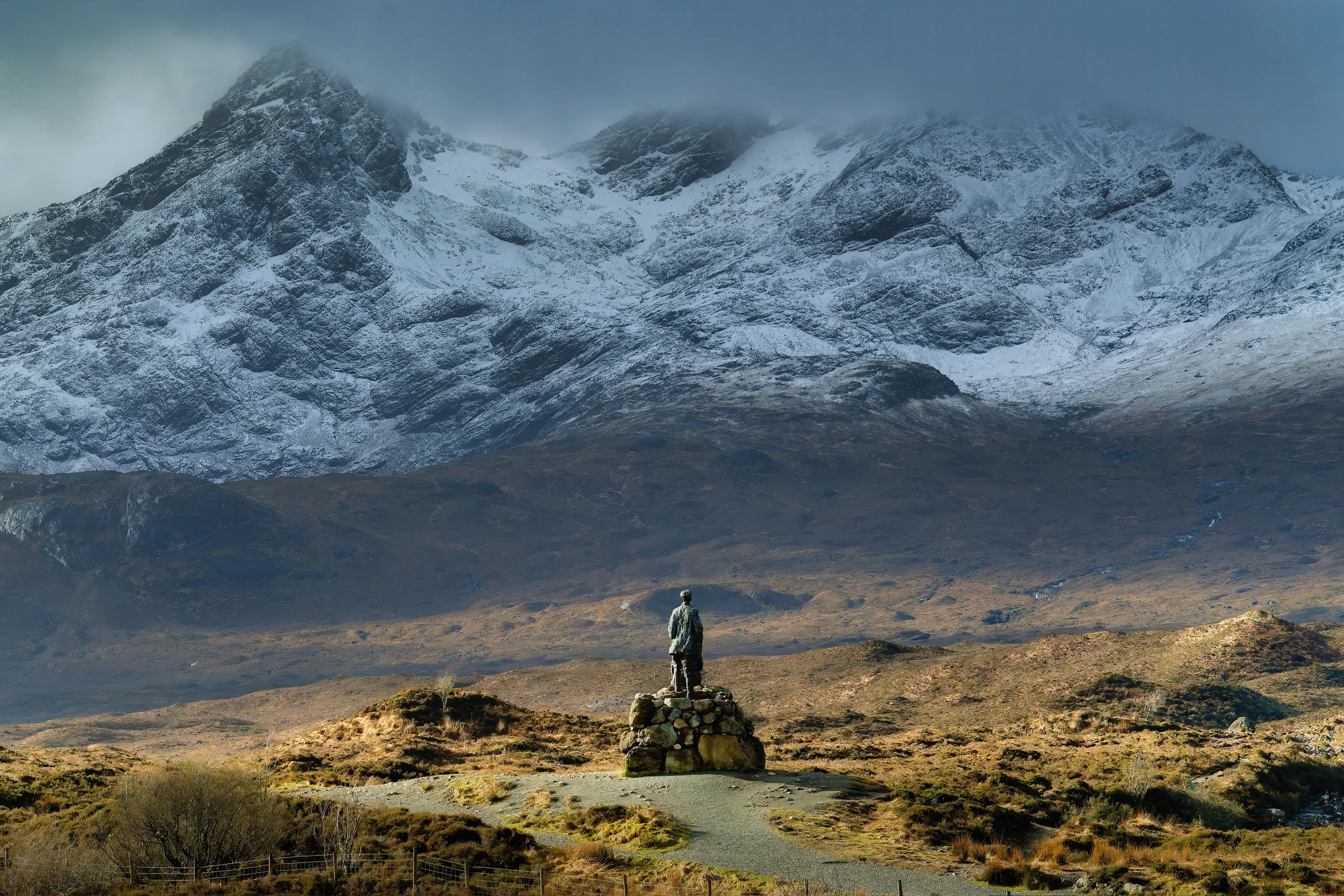 <p>These are from Friday morning after a fresh fall of snow overnight on the higher tops. The statue is of Collie and Mackenzie, two of the early pioneers of climbing the Cuillins, at Sligachan on the Isle of Skye <a href="/tags/isleofskye/" rel="tag">#IsleOfSkye</a> <a href="/tags/scotland/" rel="tag">#Scotland</a></p>