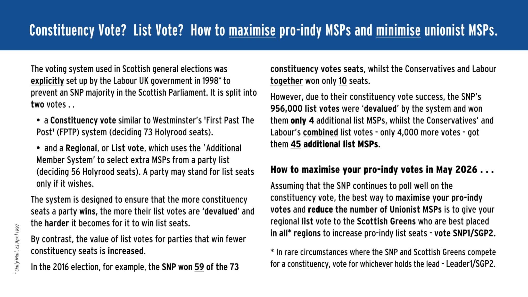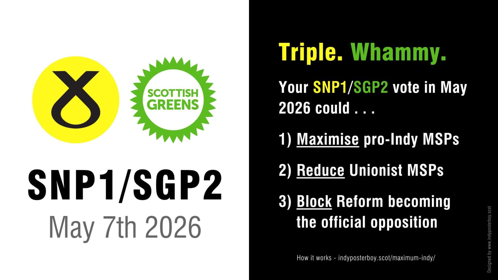 <p>Maximise pro-indy MSPs. Reduce Unionist MSPs. Block Reform UK becoming the official opposition. Increase chances of an SNP/Greens government where the Greens pull SNP to the left, and the SNP helps keep the Greens feet on the ground. What’s not to like?<br><a href="/tags/scotland/" rel="tag">#Scotland</a> <a href="/tags/holyrood26/" rel="tag">#Holyrood26</a> <a href="/tags/snp1sgp2/" rel="tag">#SNP1SGP2</a> <a href="/tags/independenceisnormal/" rel="tag">#IndependenceIsNormal</a></p>