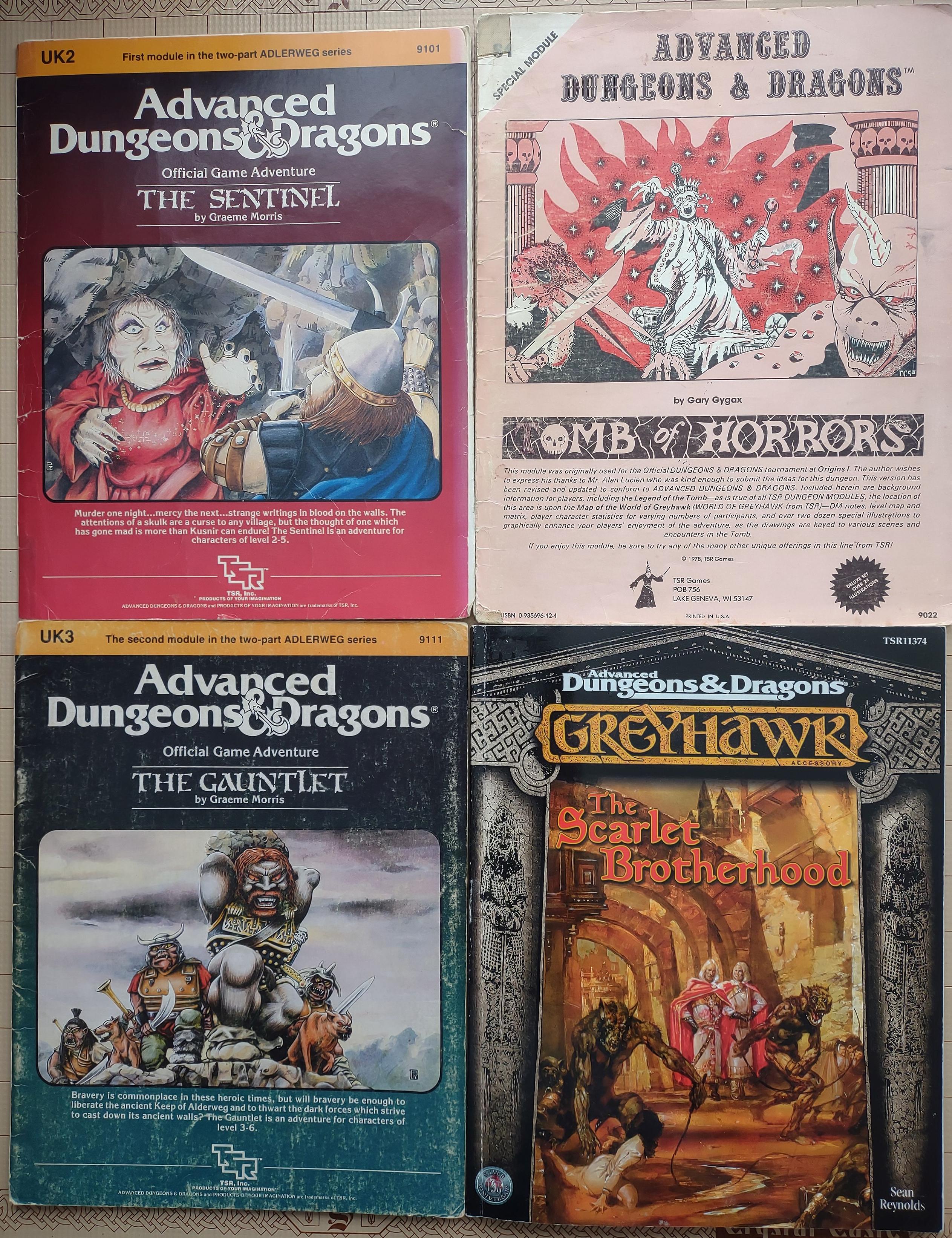 Some 1st edition classics, all-time favorite Tomb of Horrors, and The Alderweg series from the UK.