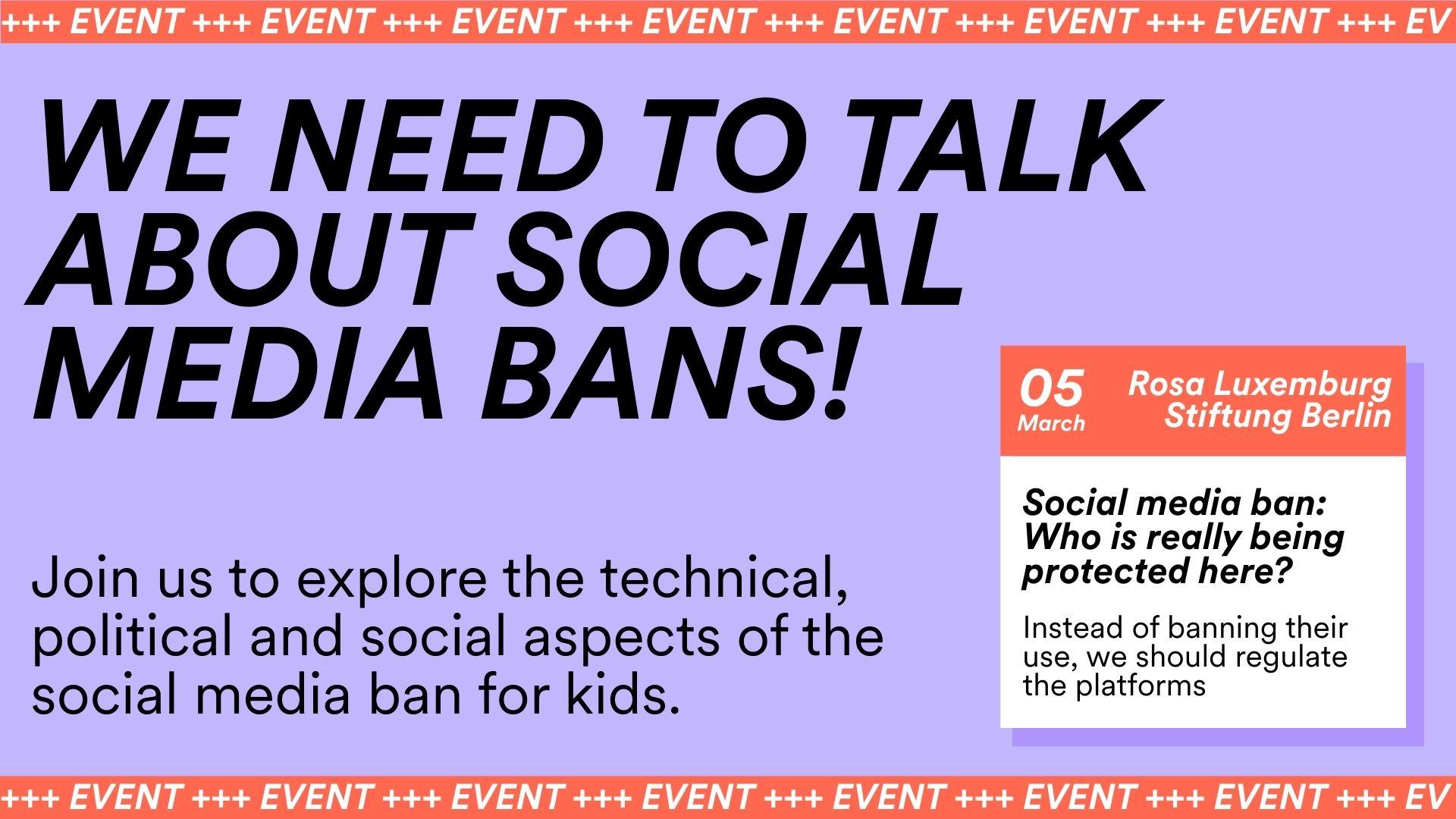 <p>Morgen, 20 Uhr in Berlin, auf deutsch und englisch - kommt und diskutiert mit!</p><p>Mehr Info: <a href="https://www.rosalux.de/veranstaltung/es_detail/CV5DR" rel="nofollow" class="ellipsis" title="www.rosalux.de/veranstaltung/es_detail/CV5DR"><span class="invisible">https://</span><span class="ellipsis">www.rosalux.de/veranstaltung/e</span><span class="invisible">s_detail/CV5DR</span></a></p><p>Mit:<br><span class="h-card"><a href="https://systemli.social/@anneroth" class="u-url mention" rel="nofollow noopener noreferrer" target="_blank">@<span>anneroth</span></a></span> <br><span class="h-card"><a href="https://mastodon.social/@carmelatroncoso" class="u-url mention" rel="nofollow noopener noreferrer" target="_blank">@<span>carmelatroncoso</span></a></span> <br><span class="h-card"><a href="https://chaos.social/@eliza" class="u-url mention" rel="nofollow noopener noreferrer" target="_blank">@<span>eliza</span></a></span> </p><p><a href="/tags/socialmediaban/" rel="tag">#socialmediaban</a></p>