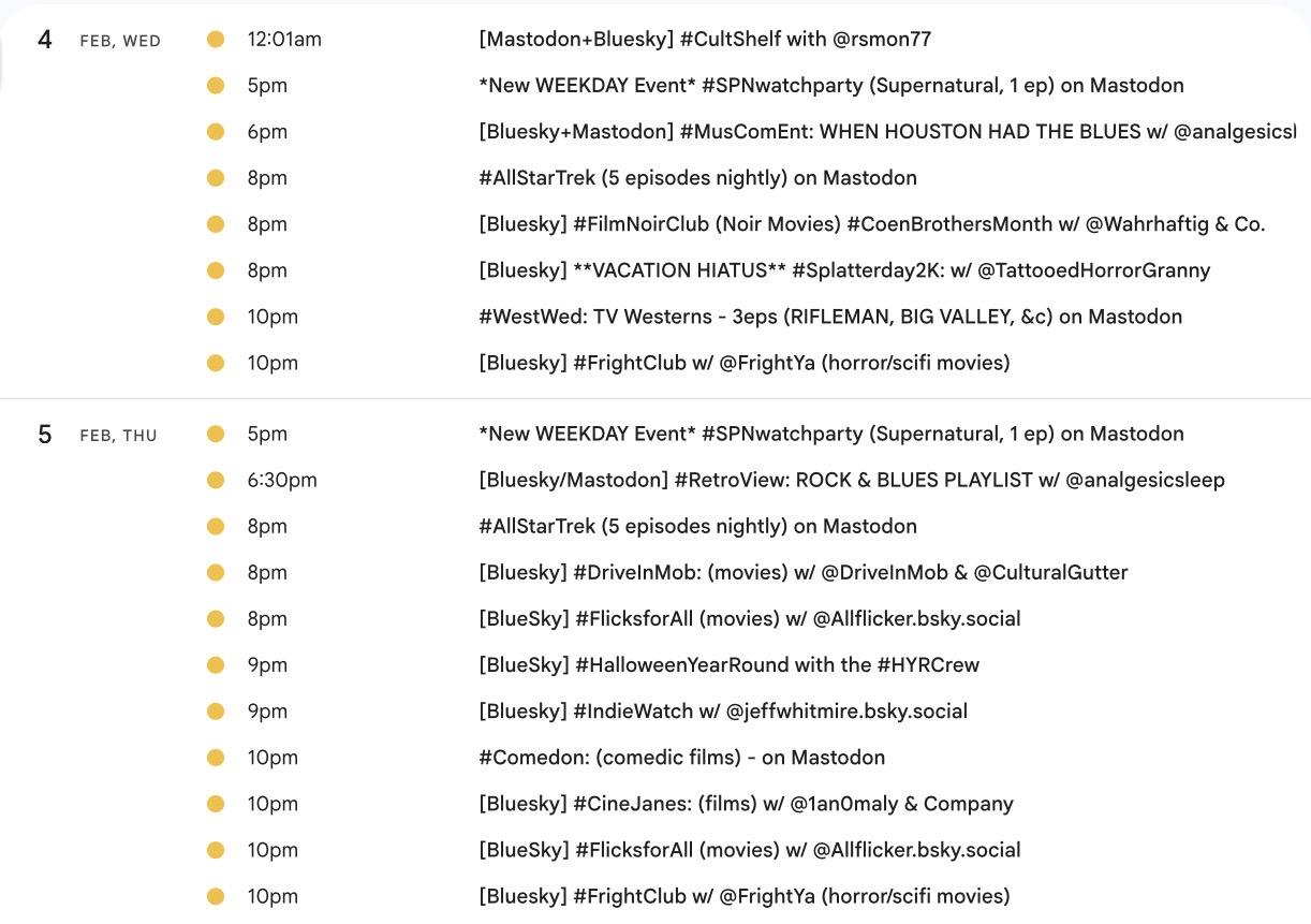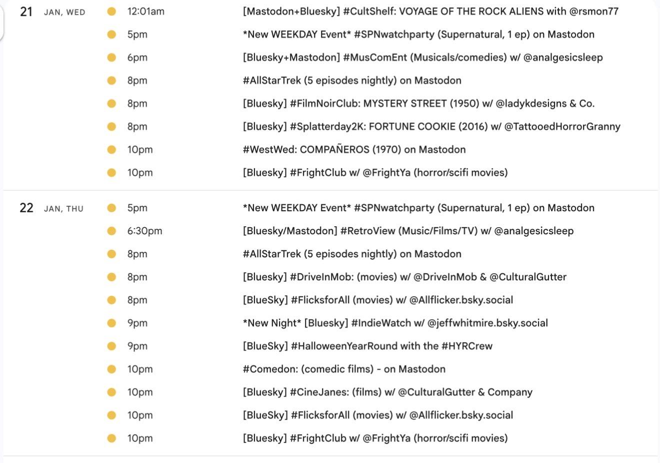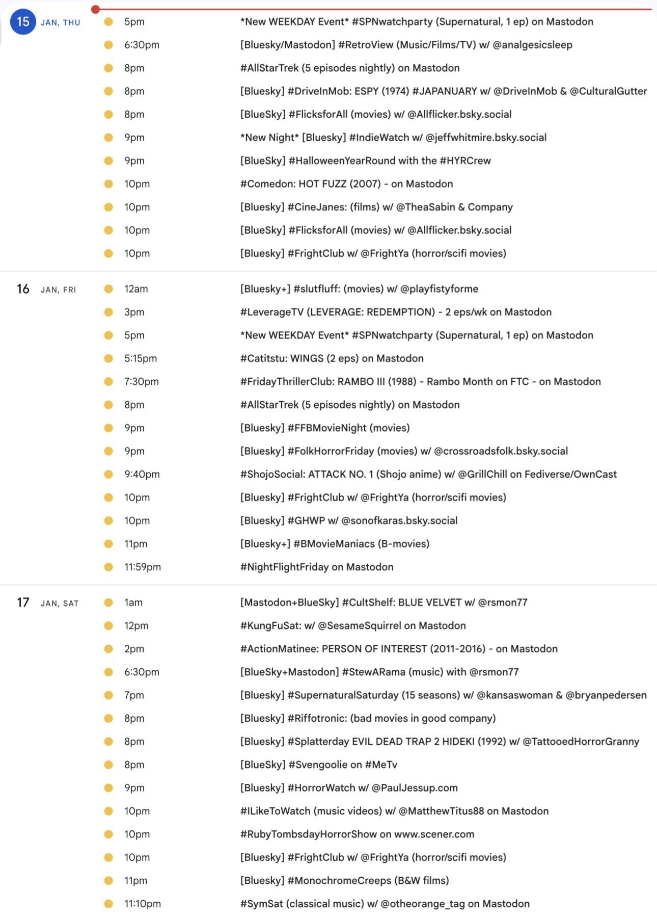 Greetings! 📺 It's the weekly #Mastodon/ #Fediverse #WatchPartyCalendar for Jan. 8-15 (Thu-Thu)
