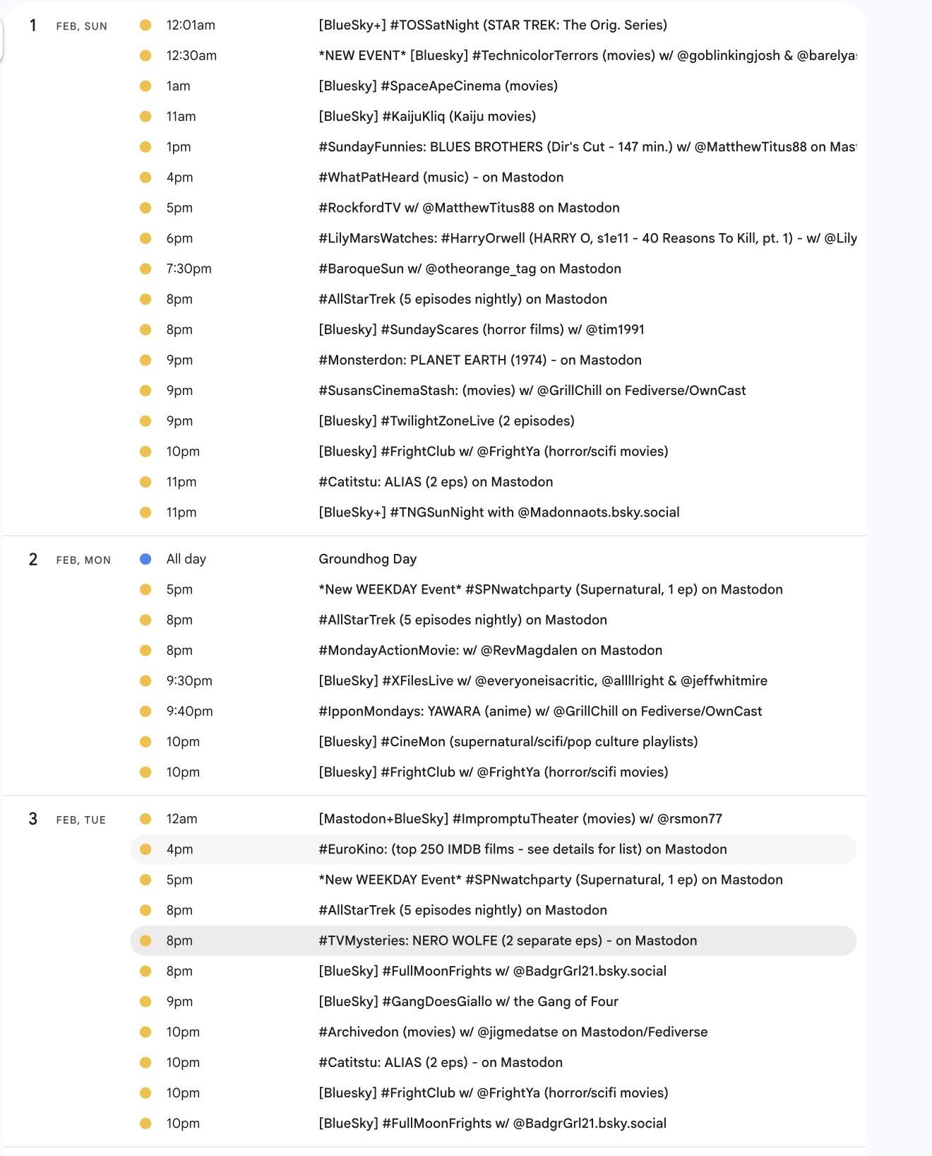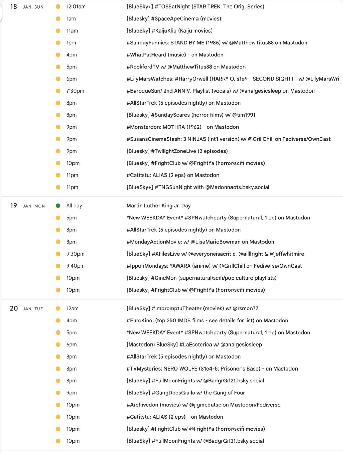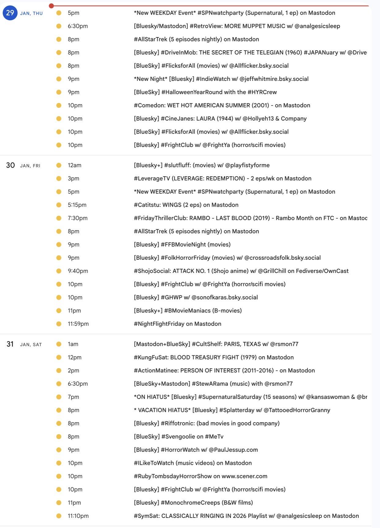 Greetings! 📺 It's the weekly #Mastodon/ #Fediverse #WatchPartyCalendar for Jan. 8-15 (Thu-Thu)