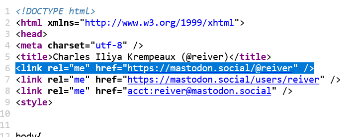 <link rel="me" href="YOUR_PROFILE_URL_HERE" />