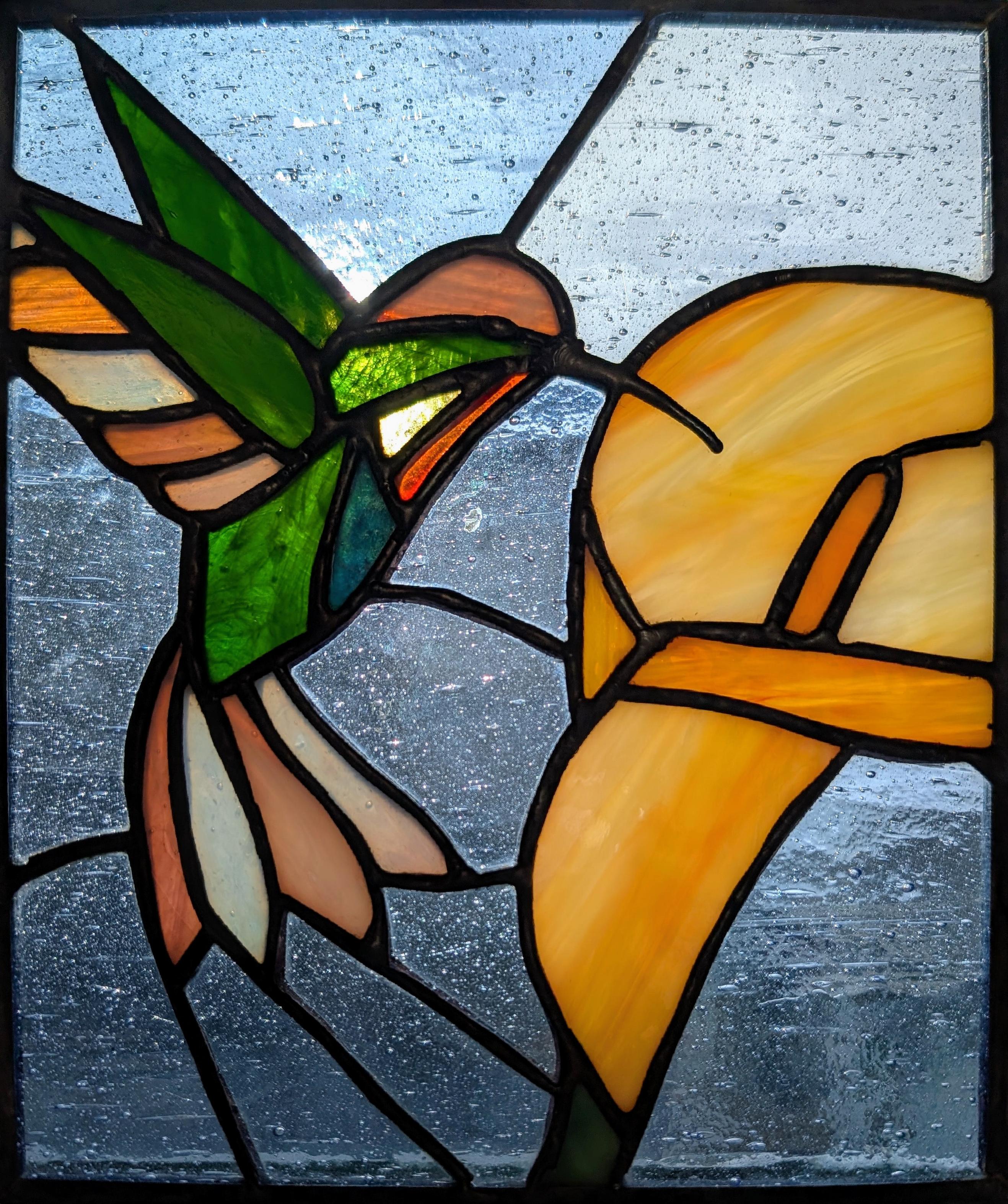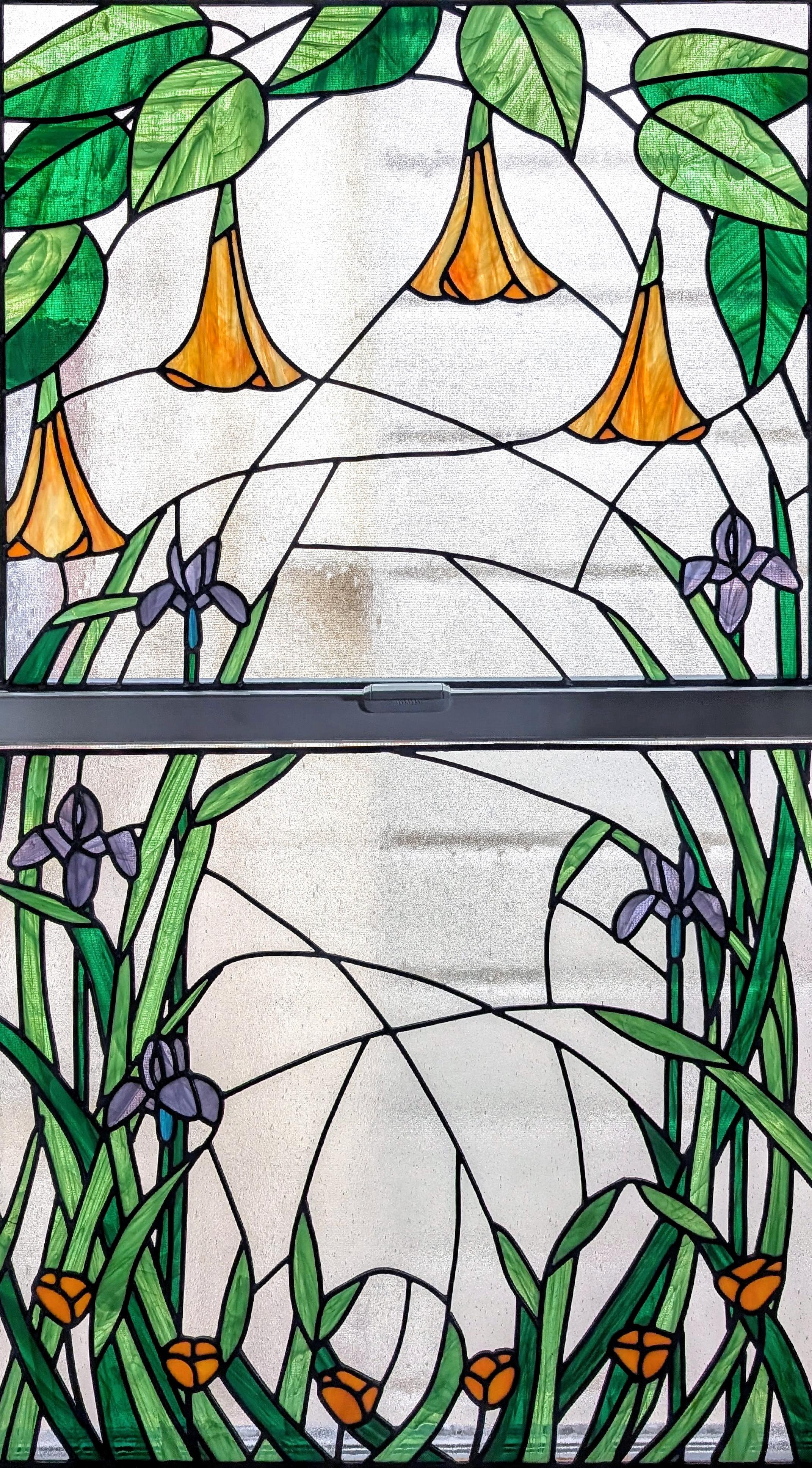 I finished this stained glass window this summer. My design features flowers that grow all over San Francisco: California poppies, Douglas irises, and angel's trumpets.