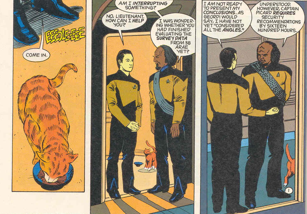 In 1993, DC Comics published a special issue of their Star Trek: The Next Generation comic. One of the stories was "Spot's Day", inspired by "Data's Day", in which Spot escapes Data's quarters and goes on a little adventure.