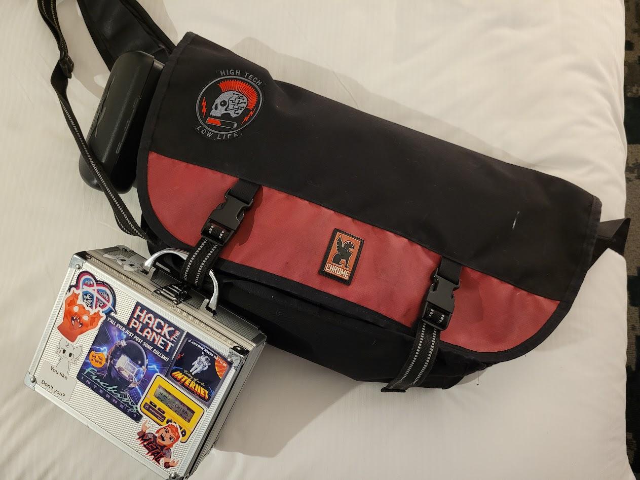 #DEFCON is upon us! I'm on my way. Follow the trail of Three Traces stickers to the Black & Red High Tech Low Life Chrome Bag this weekend if you want to claim a #sticker or #SAO! Show Townie or #Veilid swag to get a Digital Front SAO FREE! Otherwise they're $15 each, or $20 if you want to impress me with your show of support. 5 colors available. Stickers are about free fiddy. PWYW. I'll probably be wandering around near the HHV-SSV, ESV, CHV, BHV, PSV, LPV, and/or IOTV a lot.