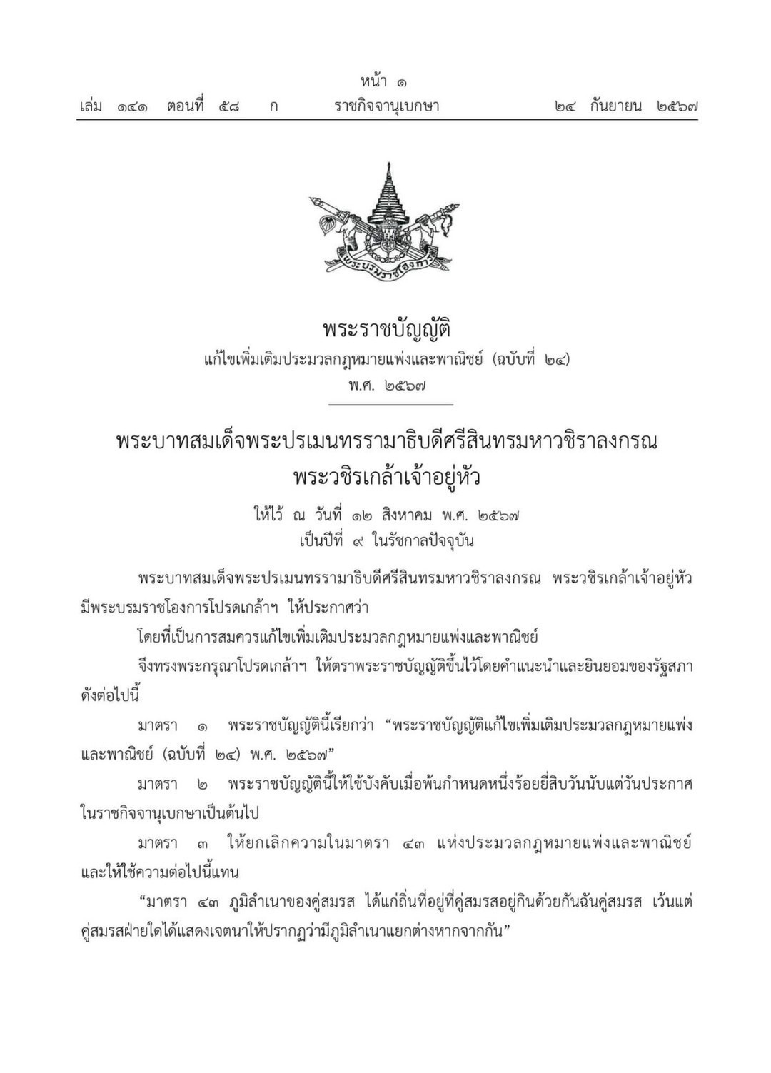 在最新的王家公報中,泰國國王已經批准修訂「民商法典」,也就是通過「婚姻平權法案」,此法案將於120日後正式生效,生效日是2025年1月22日。