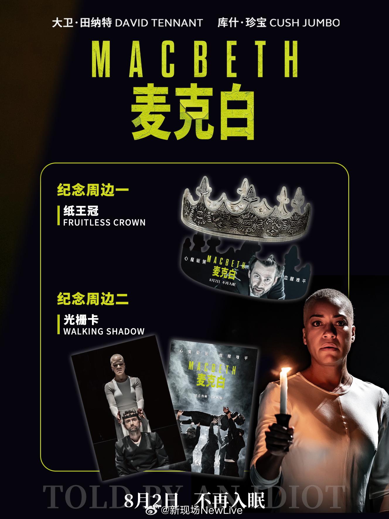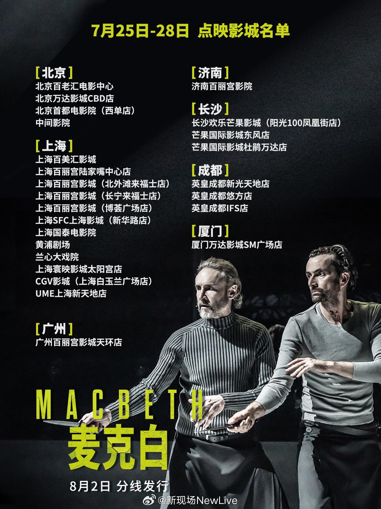 #舞台纪录电影麦克白定档 今日起,大卫·田纳特 #davidtennant 领衔《麦克白》在25家影城率先开启点映,8月2日起50余个城市分线发行!长按识别海报二维码或猫眼、淘票票平台搜索购票! [手指比心] [手指比心] 本版看点 [手指比心] [手指比心] -本版《麦克白》由英国著名演员、“神秘博士”大卫·田纳特化身野心勃勃的权谋之士,和库什·珍宝饰演的麦克白夫人共同掀起一场血雨腥风。