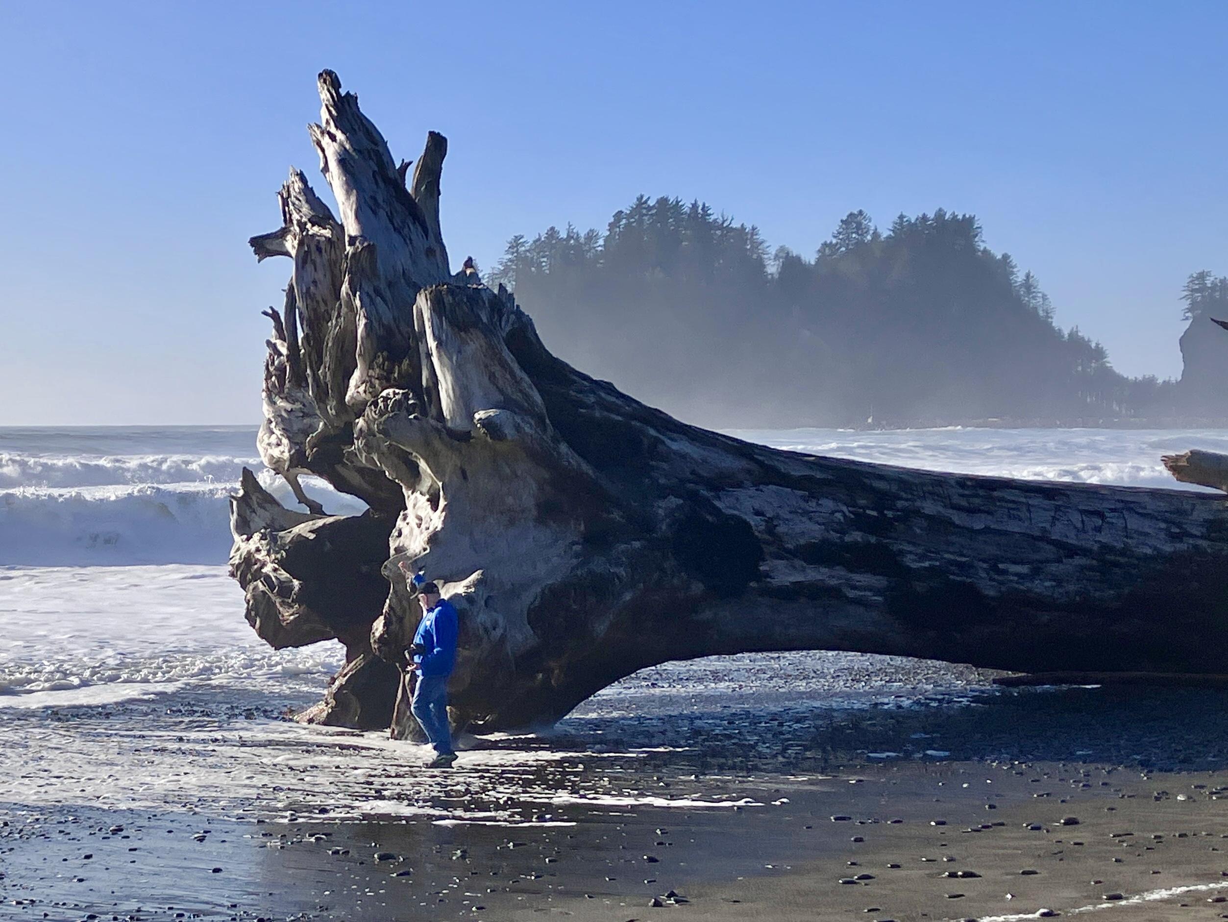 Here I stand, a tiny human, at the root wad of maybe the biggest drift log I've seen, a gargantuan Sitka spruce. It's been lodged in the sand of First Beach at La Push for several years. The beast undoubtedly came down on high flows one of the rivers of the Olympic rain forests. My sweetie took the pic. #ThickTrunkTuesday #AltText