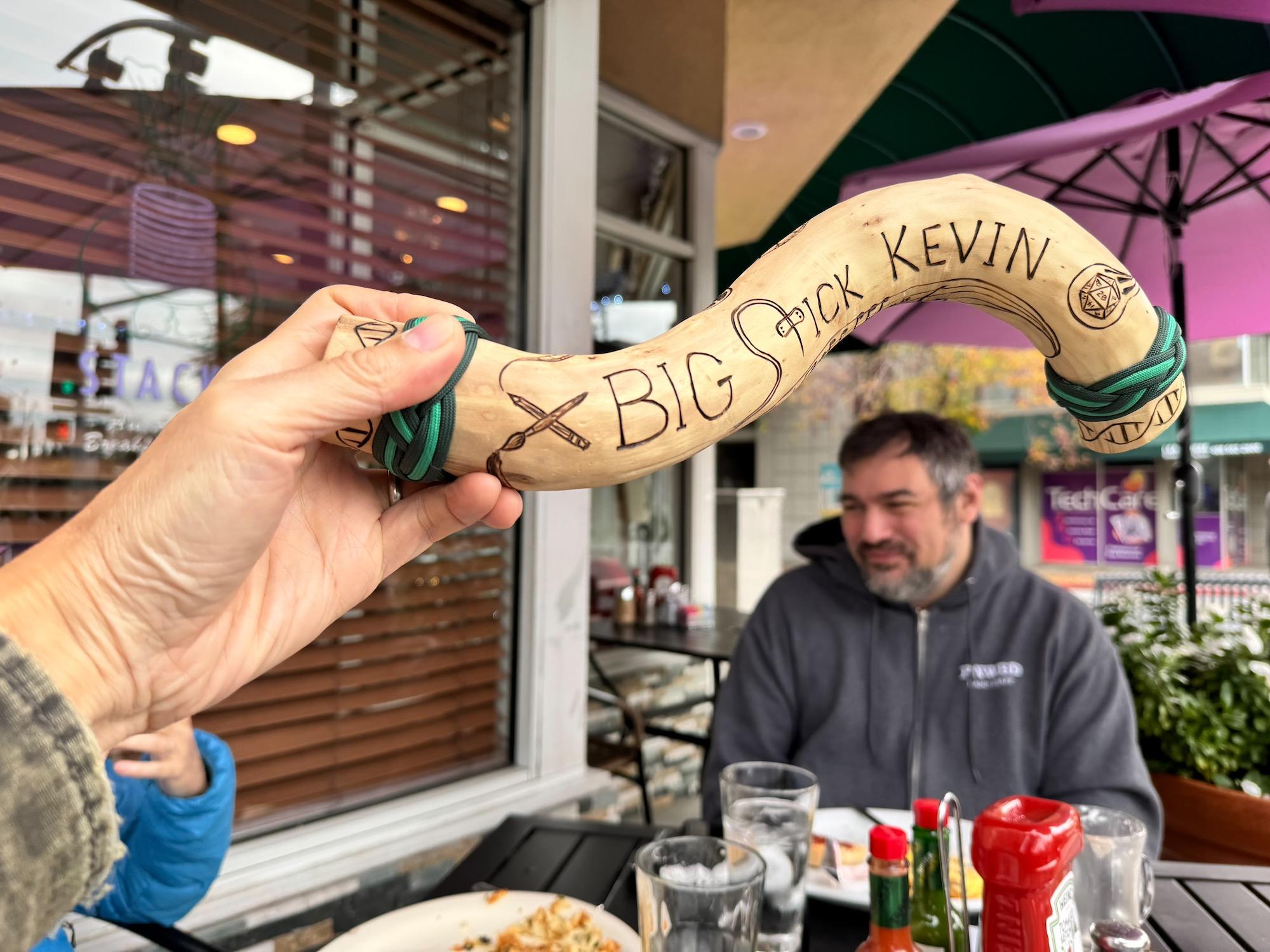 Kevin's at the camp for work reasons, but he's also volunteering to give back. He hand carves every child their own custom stick trophy to award to them after they've taken a needle and made their "big stick".