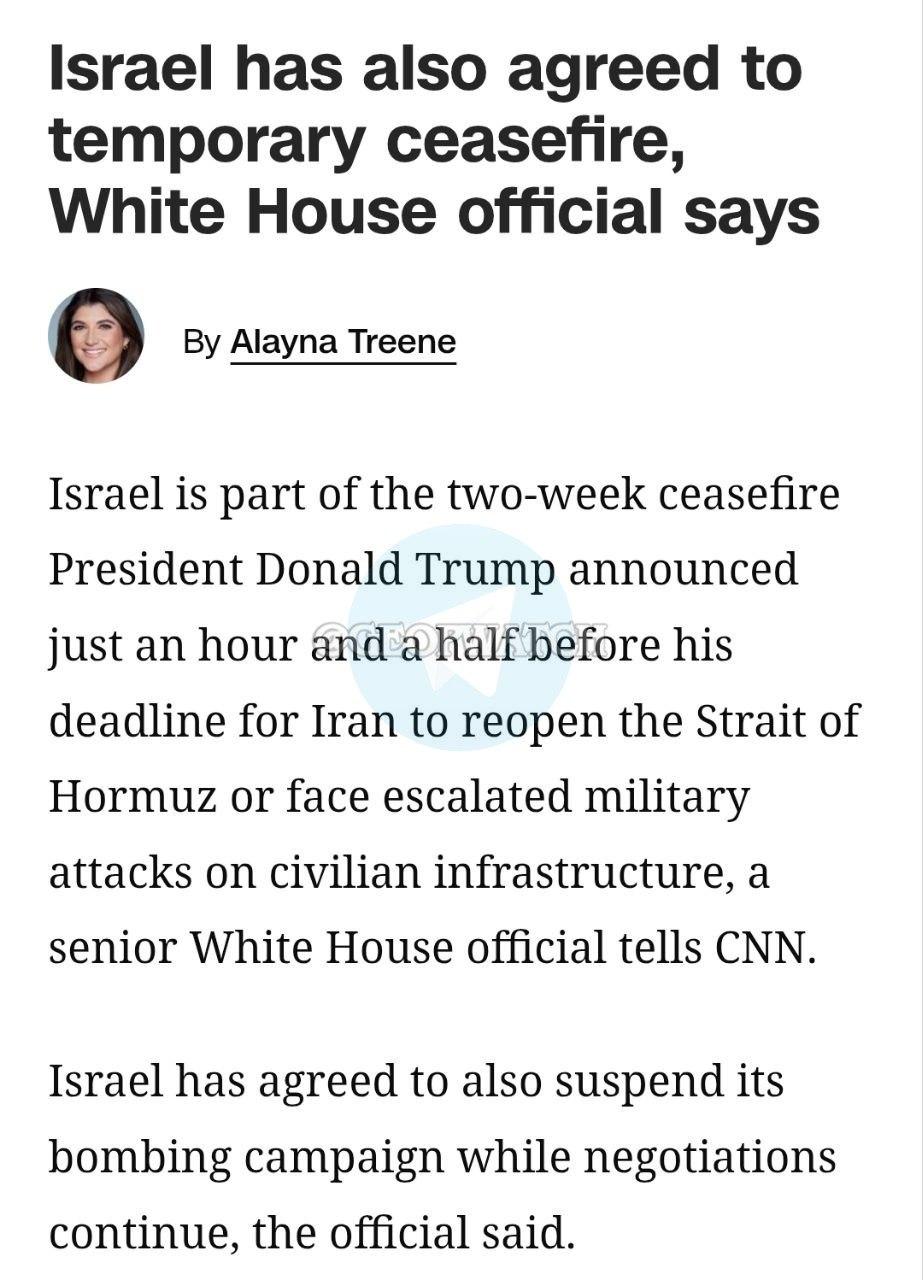 <p>Israel has also agreed to the two weeks ceasefire according to a White House official, per CNN.</p><p><a href="/tags/iran/" rel="tag">#Iran</a> <a href="/tags/israel/" rel="tag">#Israel</a> <a href="/tags/trump/" rel="tag">#tRump</a> <a href="/tags/ceasefire/" rel="tag">#Ceasefire</a></p>