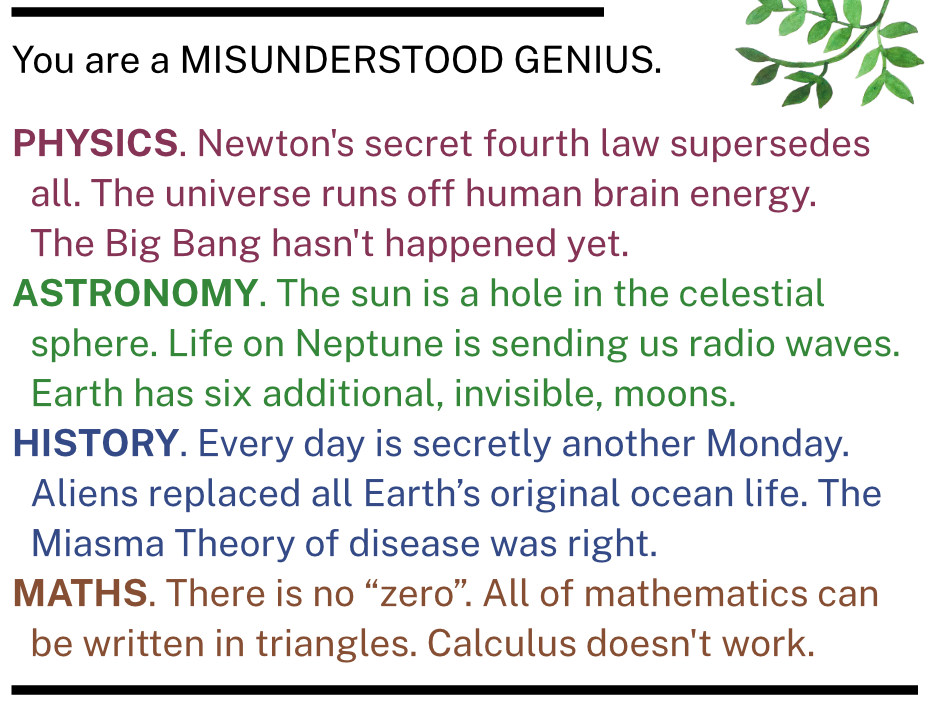 Here's my #1pRPGjam contribution! Cranks & Crackpots is a free one-page solo RPG about having the delusion that you have arrived at a universal scientific truth.