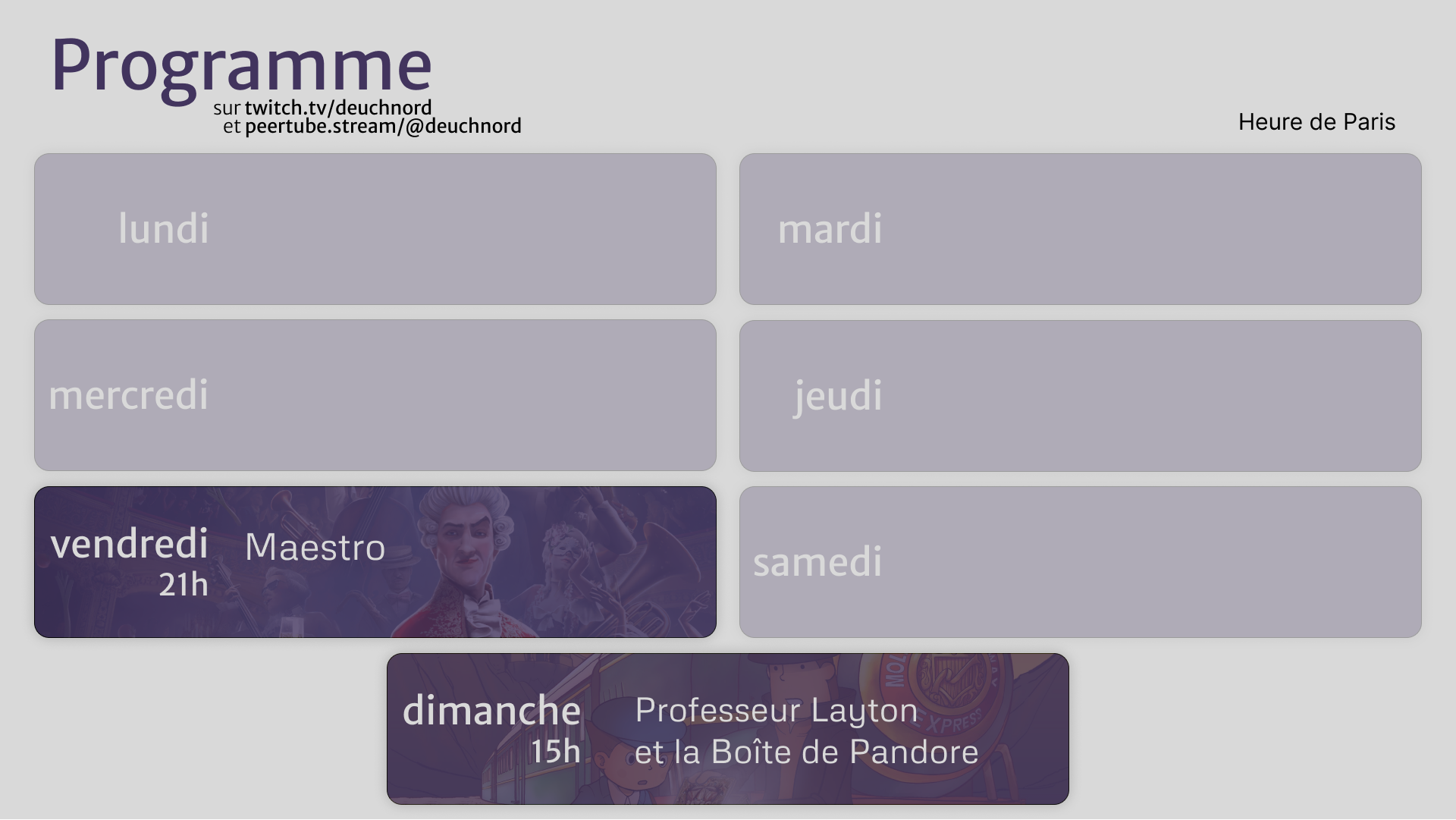 <p>Attention, nouveau programme !<br>Le vendredi soir, on remplace la série "Ace Attorney" par une session musicale pour se reposer le cerveau après la semaine de travail !<br>Et bien sûr, le dimanche, on se chauffe les méninges sur les énigmes du Professeur Layton !</p><p>En direct sur <a href="/tags/twitch/" rel="tag">#Twitch</a> et <a href="/tags/peertube/" rel="tag">#PeerTube</a> !</p>