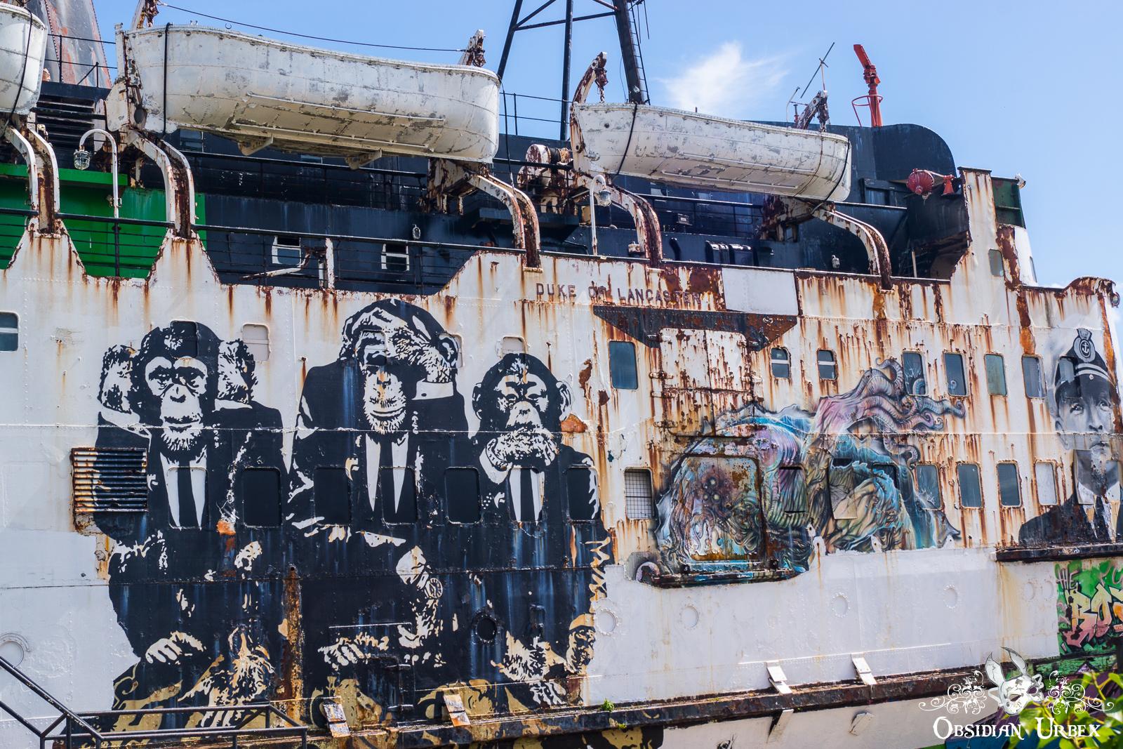 In 2012 graffiti artists from Europe and the UK were commissioned to spray murals. In 2017 the ship was repainted black!