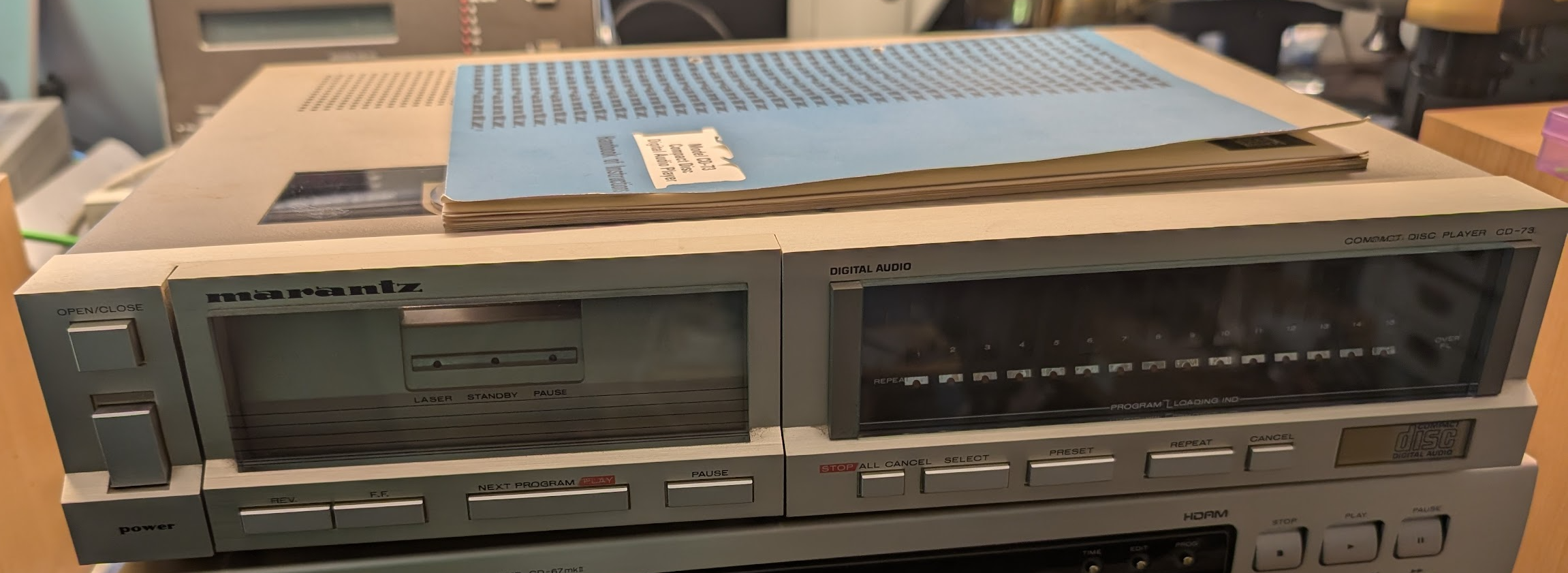 This week in the lab: A Marantz CD 73, an early CD player from 1983. Symptoms: A loud whine coming from the back with erratic behaviour, flickering lights. The loading mechanism moves sometimes, it tries to spin the disc (which usually means the pickup mostly works), but can't play. #vintage #hifi #marantz #repair
