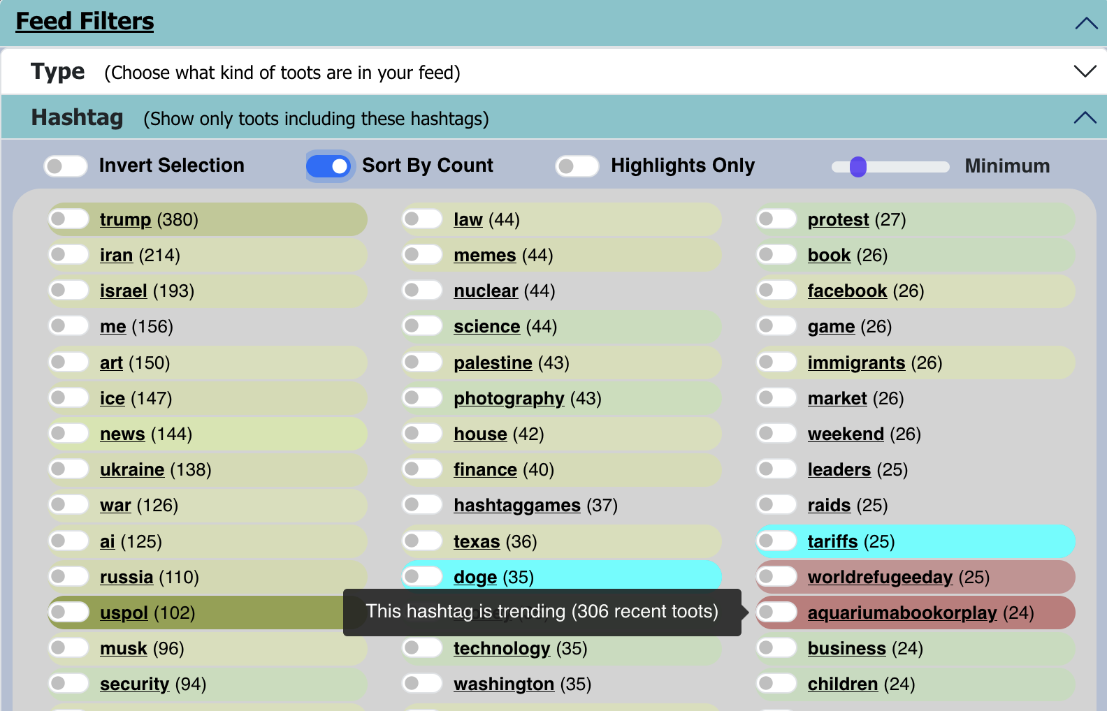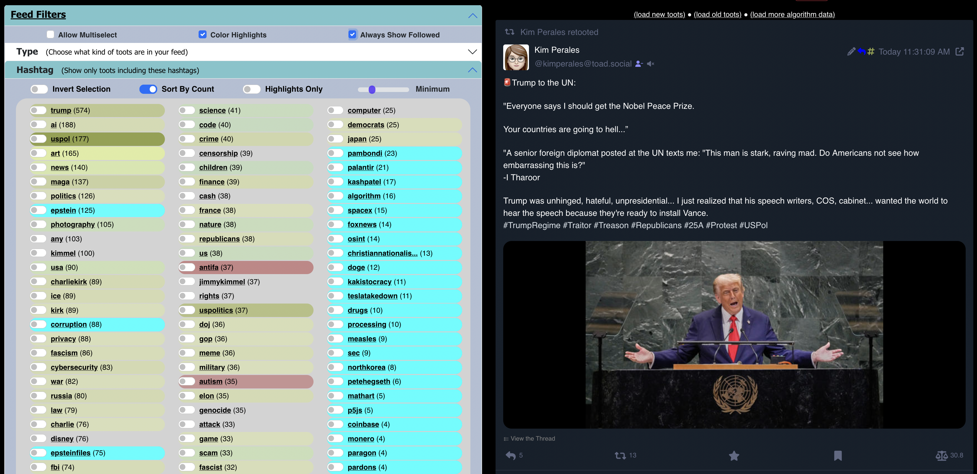 #FediAlgo (the customizable timeline algorithm / filtering system for your Mastodon feed) v1.2.2 is deployed now. Has a switch that makes sure any #hashtags / users / etc. that you follow are displayed as filter options even if they don't meet the minimum number of recent toots threshold.