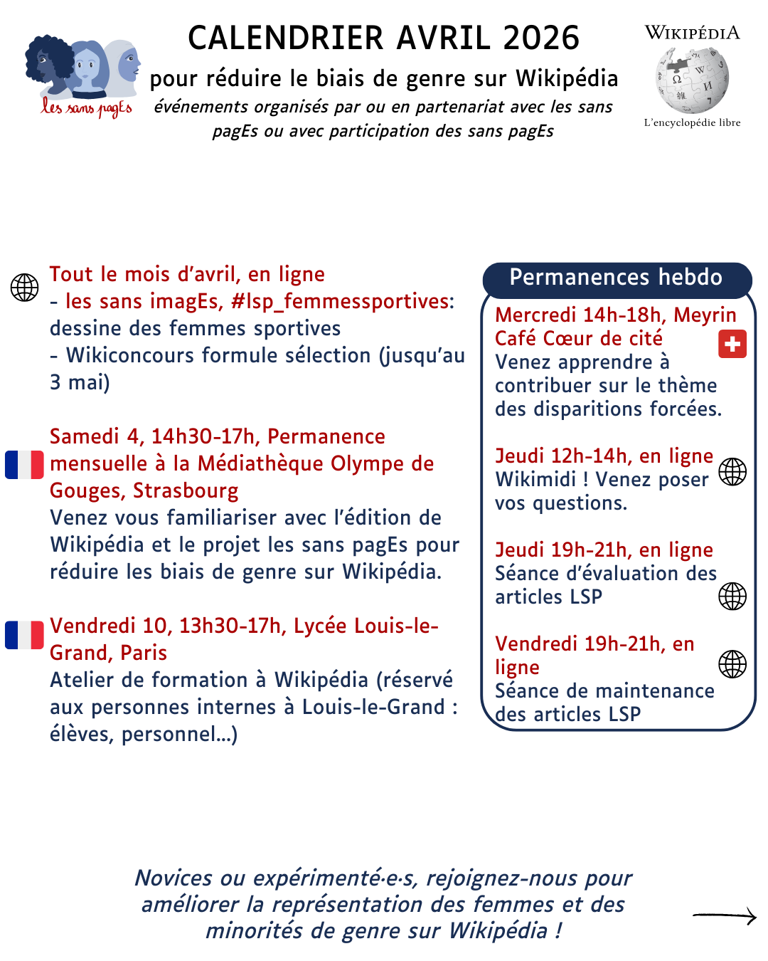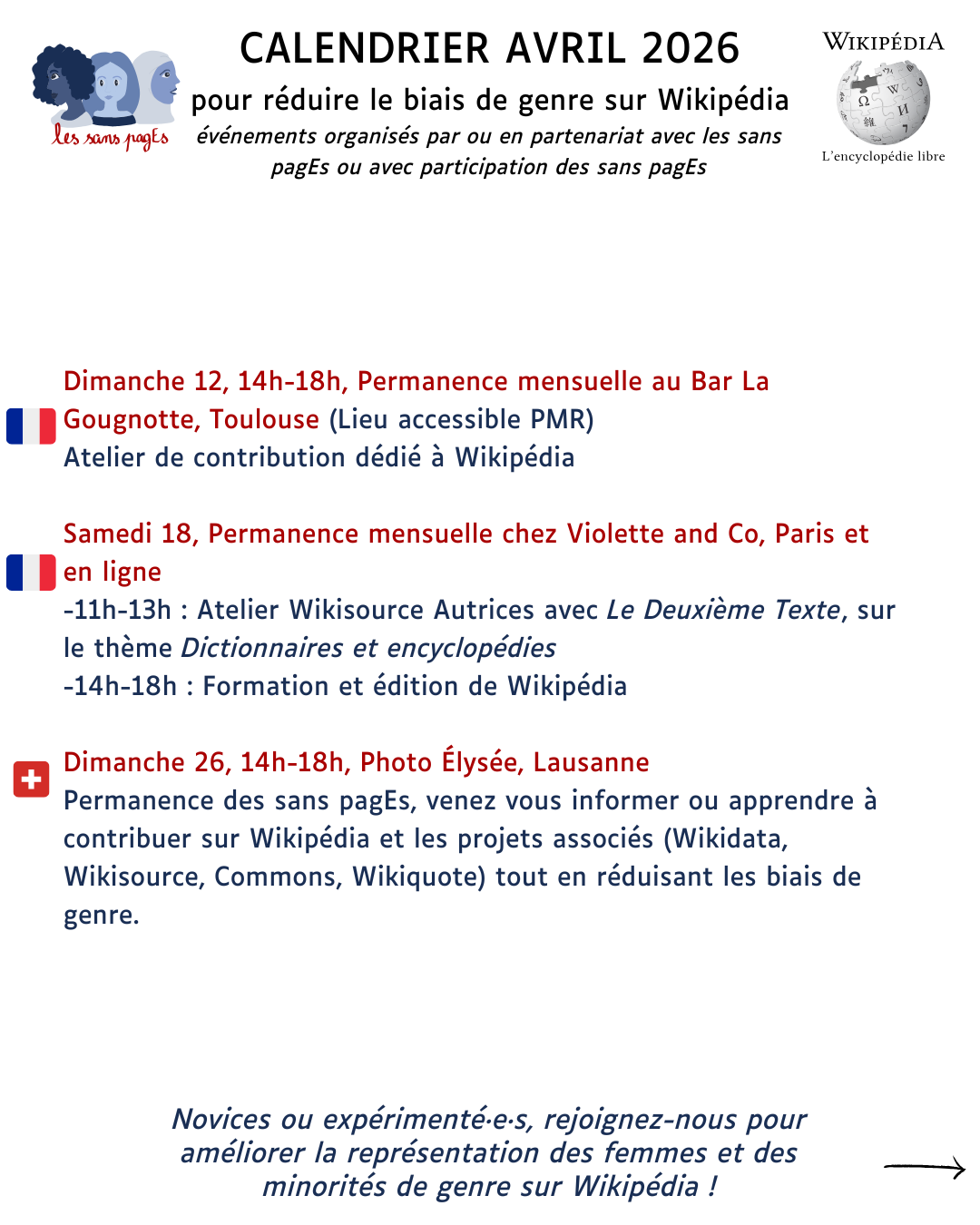 <p>Le programme d'avril est un peu plus léger que celui de mars mais on espère vous voir nombreux•ses pour éditer <span class="h-card"><a href="https://wikis.world/@wikipedia_fr" class="u-url mention" rel="nofollow noopener noreferrer" target="_blank">@<span>wikipedia_fr</span></a></span> ! (Novices bienvenu•e•s !)</p><p>Avec notamment <span class="h-card"><a href="https://wikis.world/@Wikimedia_Fr" class="u-url mention" rel="nofollow noopener noreferrer" target="_blank">@<span>Wikimedia_Fr</span></a></span> <span class="h-card"><a href="https://wikis.world/@WikimediaCH" class="u-url mention" rel="nofollow noopener noreferrer" target="_blank">@<span>WikimediaCH</span></a></span> </p><p><a href="/tags/wikipedia/" rel="tag">#wikipedia</a> <a href="/tags/féminisme/" rel="tag">#féminisme</a> <a href="/tags/lessanspages/" rel="tag">#lessanspages</a> <a href="/tags/lessansimages/" rel="tag">#lessansimages</a></p>