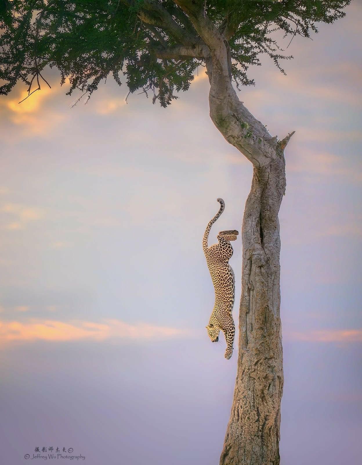 The amazing cheetah Faulu photographed running vertically down a tall tree in Masai Mara, Kenya.