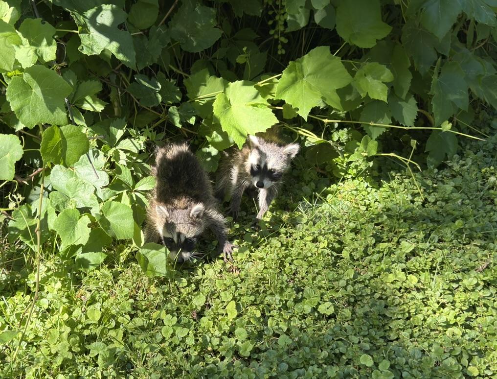 The raccoons I regularly post were born somewhere in my backyard late last May/June. The triplets were born first, and these two a little while later. I suspect these two were woken when the triplets were taken out by their mom, with these two following briefly. Didn't get very far.