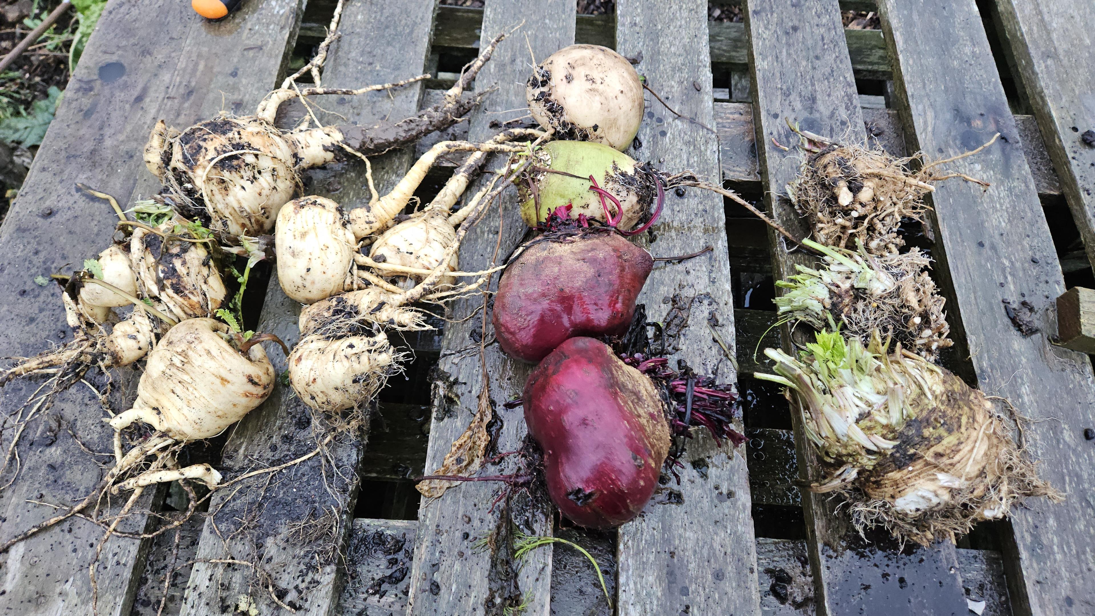 Popped down to the #allotment for a brief #WinterSolstice visit, harvested some vegetables to roast with Gunther tonight. A bit of a motley crew, but they'll do.