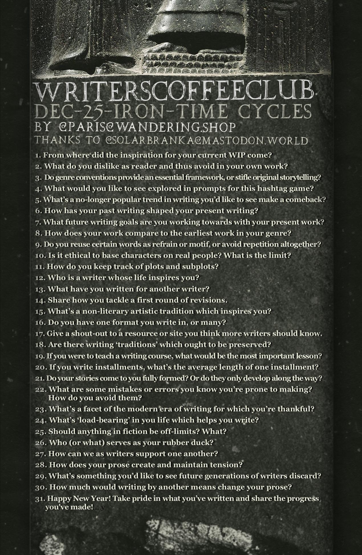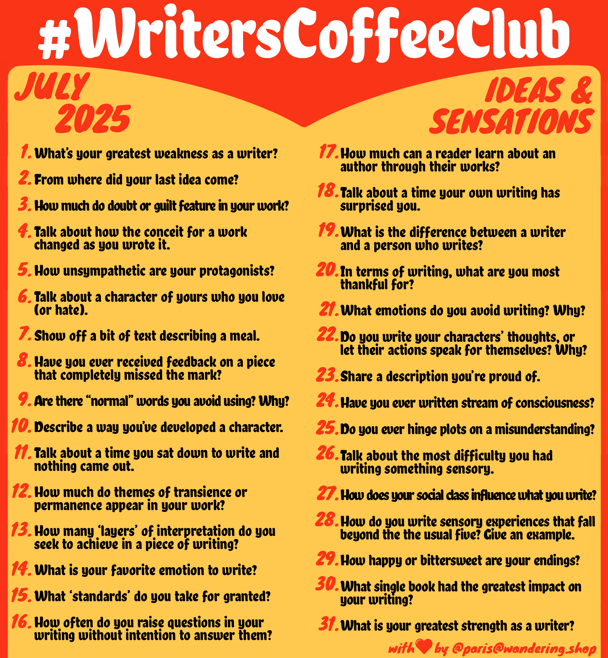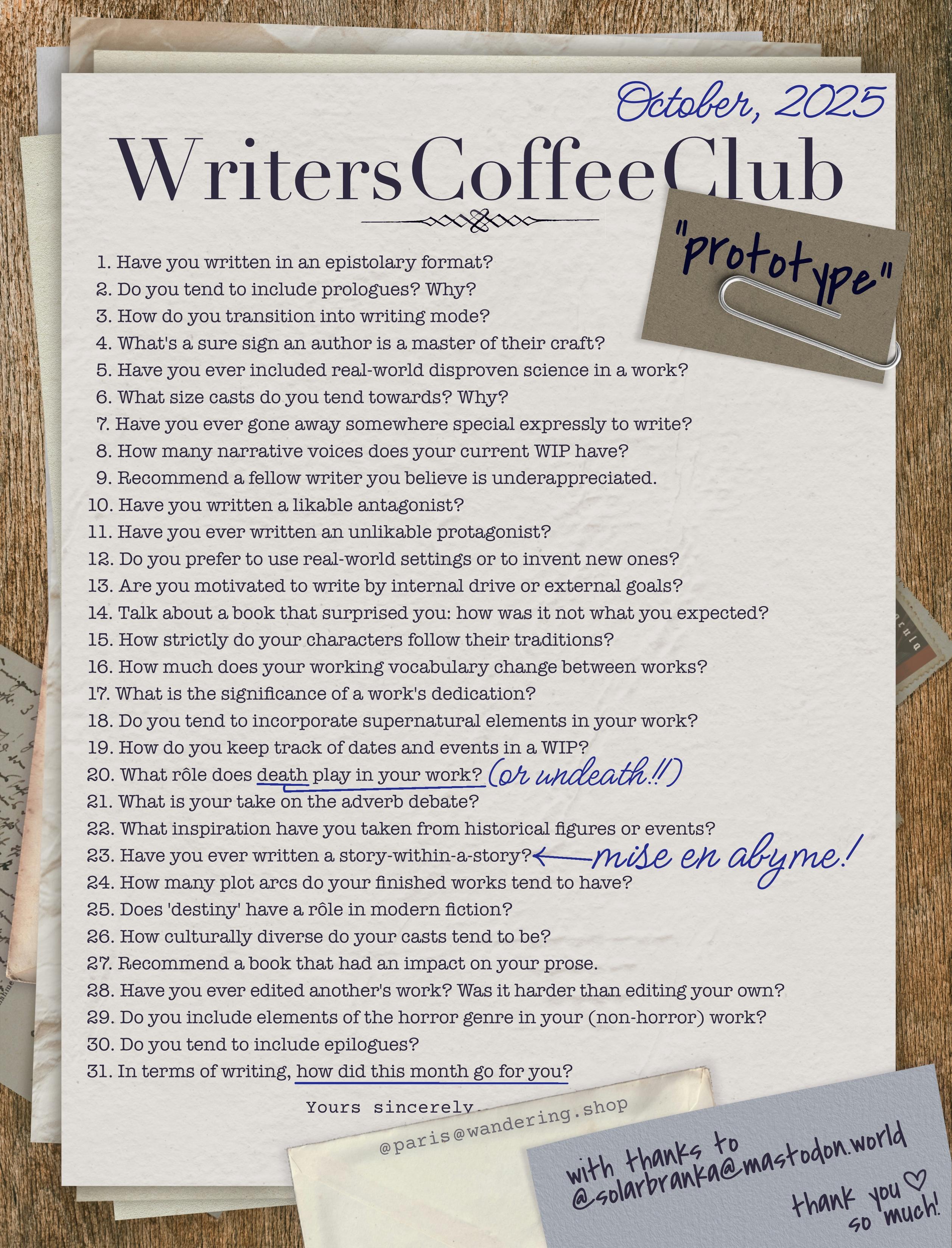 Good morning, writers of #writersCoffeeClub! It’s the end of a month, and you know what that means: September’s prompts are up! As always, a text-only version of the prompt list can be found on my blog: https://sulfur.ink/wcc-september-2025/