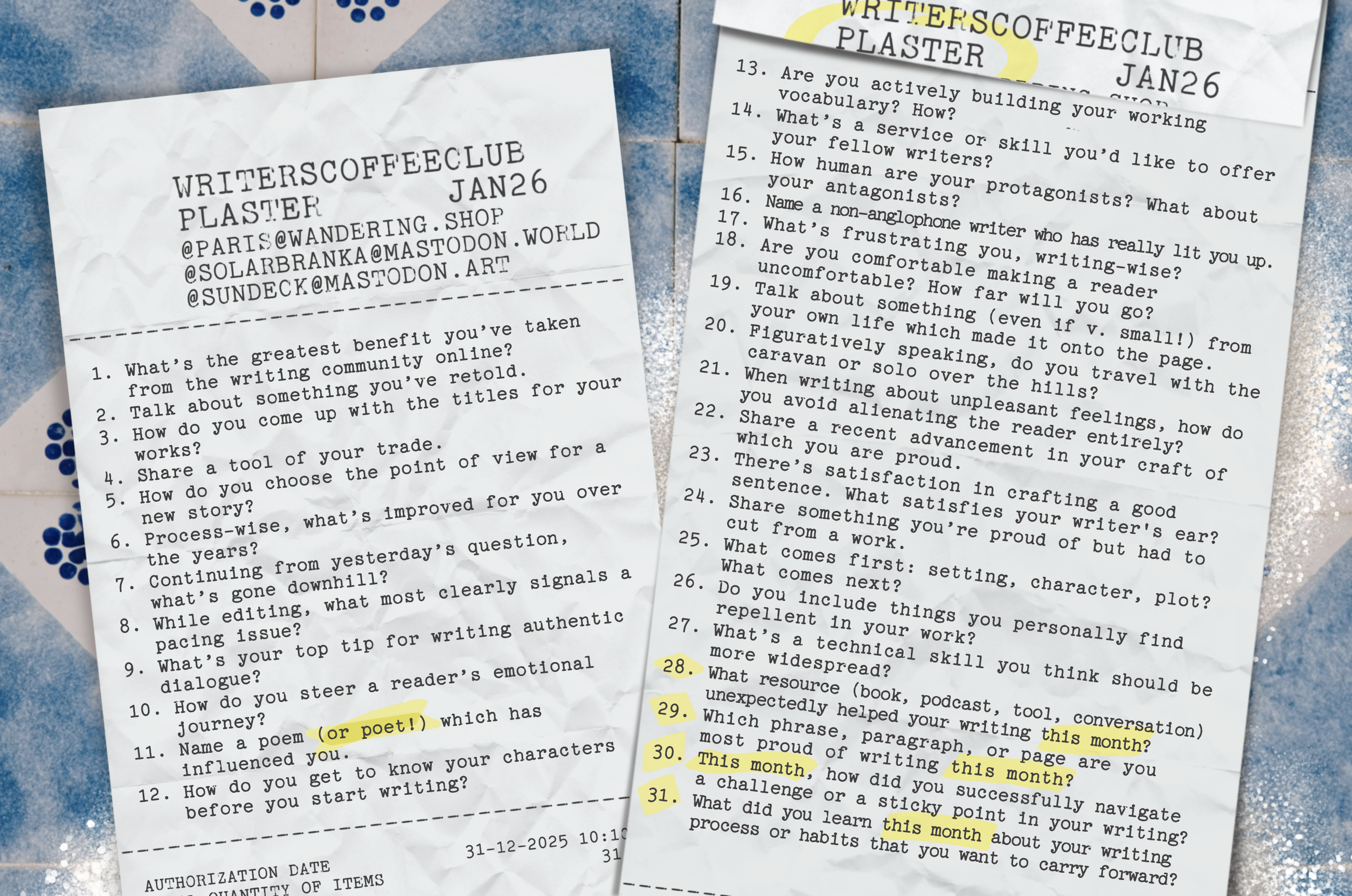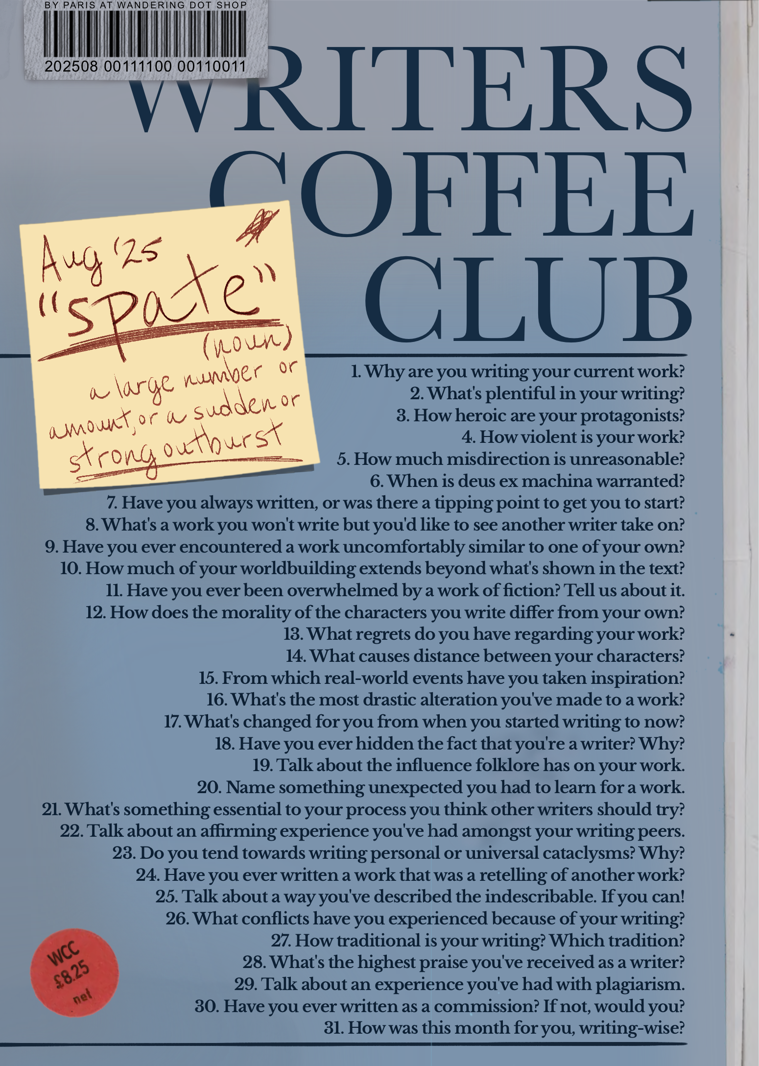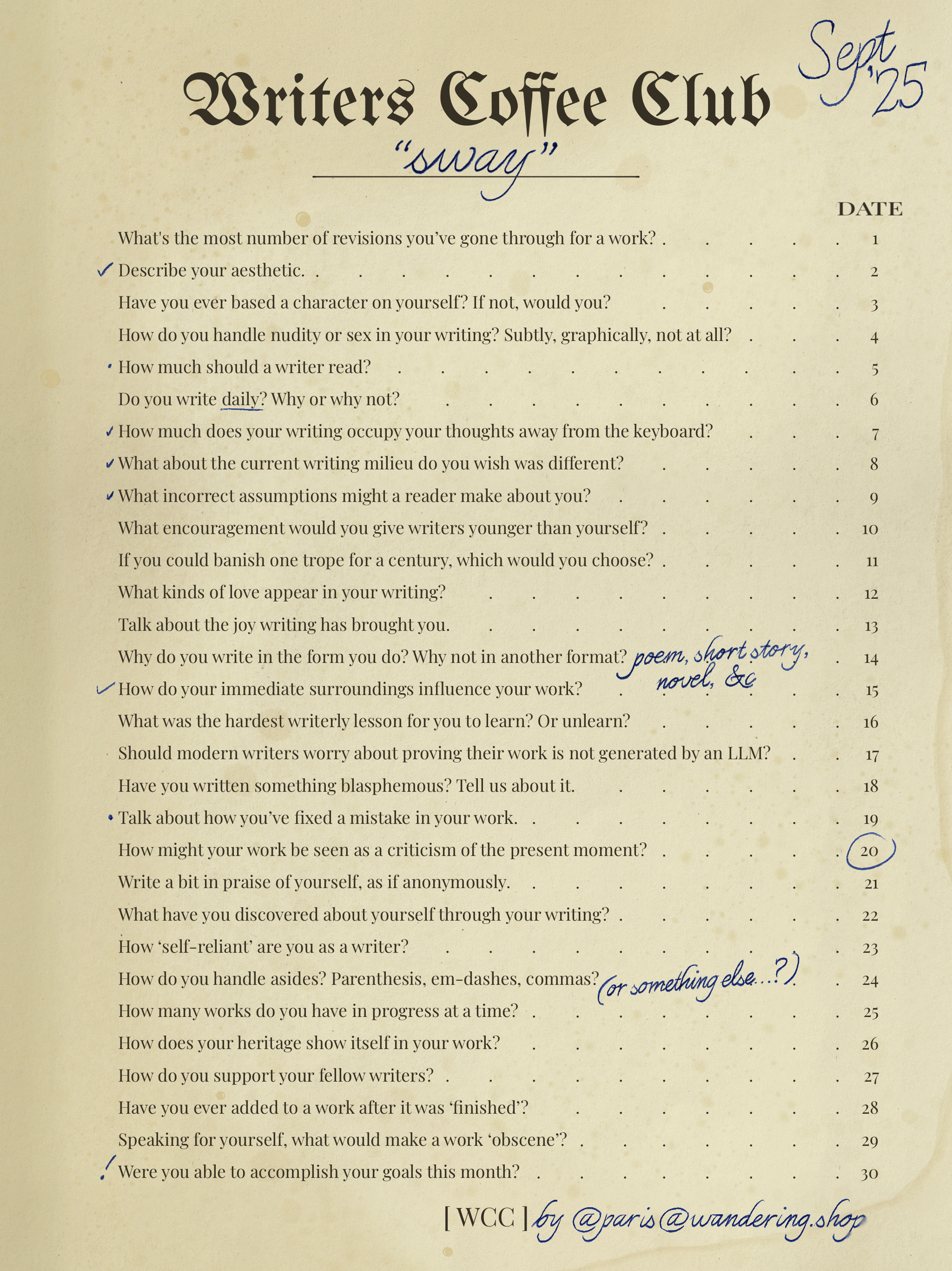 Good morning, writers of #writersCoffeeClub! It’s the end of a month, and you know what that means: September’s prompts are up! As always, a text-only version of the prompt list can be found on my blog: https://sulfur.ink/wcc-september-2025/
